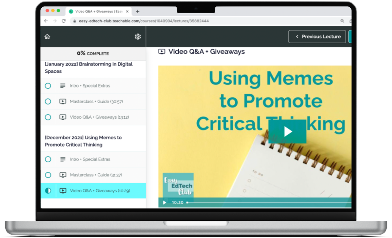 Nope, there are no extra groups to join. Some courses and memberships require you to join a Facebook group to access content, but everything in the Easy EdTech Club is hosted on a platform called Teachable. When you log in to the membership site you, can access all of the content there, and you won’t have to log in anywhere else. My goal when starting the Easy EdTech Club was to keep things simple — giving you less noise and more resources.