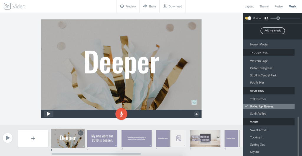 Spark Video also gives users access to a library of music. Students can choose music that is uplifting or inspiring. They can also upload their own music if they have created music with another tool like Soundtrap or Garageband.