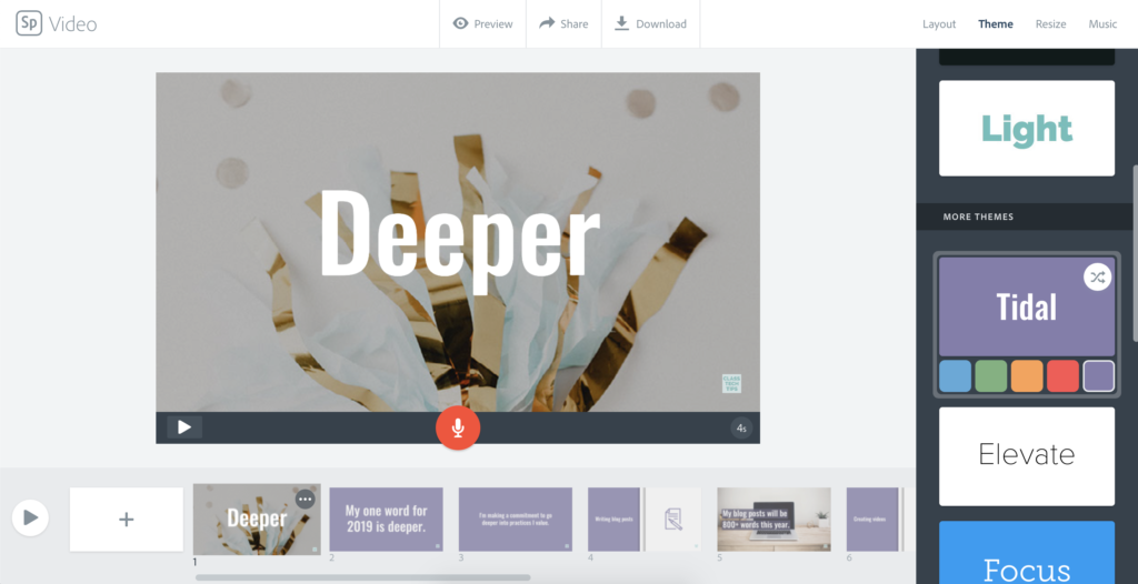 The different themes in Spark Video can connect to student goal setting as well. You might want to have a conversation with students on how colors relate to their topic. If your school has set up Spark for Education (also free) students can create custom themes around their brand.
