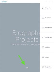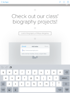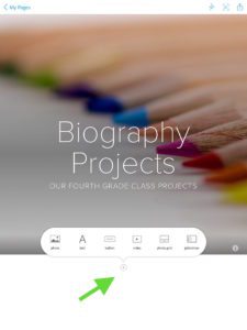In this example, you can see how Spark Page can be used by a teacher to share their class’ biography projects (at the bottom of this post you’ll find examples for student creations.) Once your title, subtitle and background image are set, scroll down for the + sign. Every time you seen the + sign on your screen you have the option to add (1) a large photo, (2) text, (3) button that links to another website, (4) video, (5) photo grid, or (6) a glideshow where you can layer another feature on top of a picture.