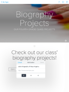 Adding a button is a terrific feature of Spark Page. This lets you link to another website including student Spark Page creations. In the example below you see how a teacher can create their own Spark Page as a way to organize student web creations all in one place. In this screenshot you see how you can add a button that goes directly to Julio’s Biography of Maya Angelou.