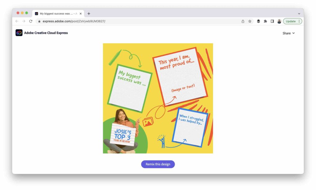 In today’s blog post, I’ll share how I used this template to create my very own year in review graphic. You can use this template to have students make a graphic with Adobe Creative Cloud Express for Education.