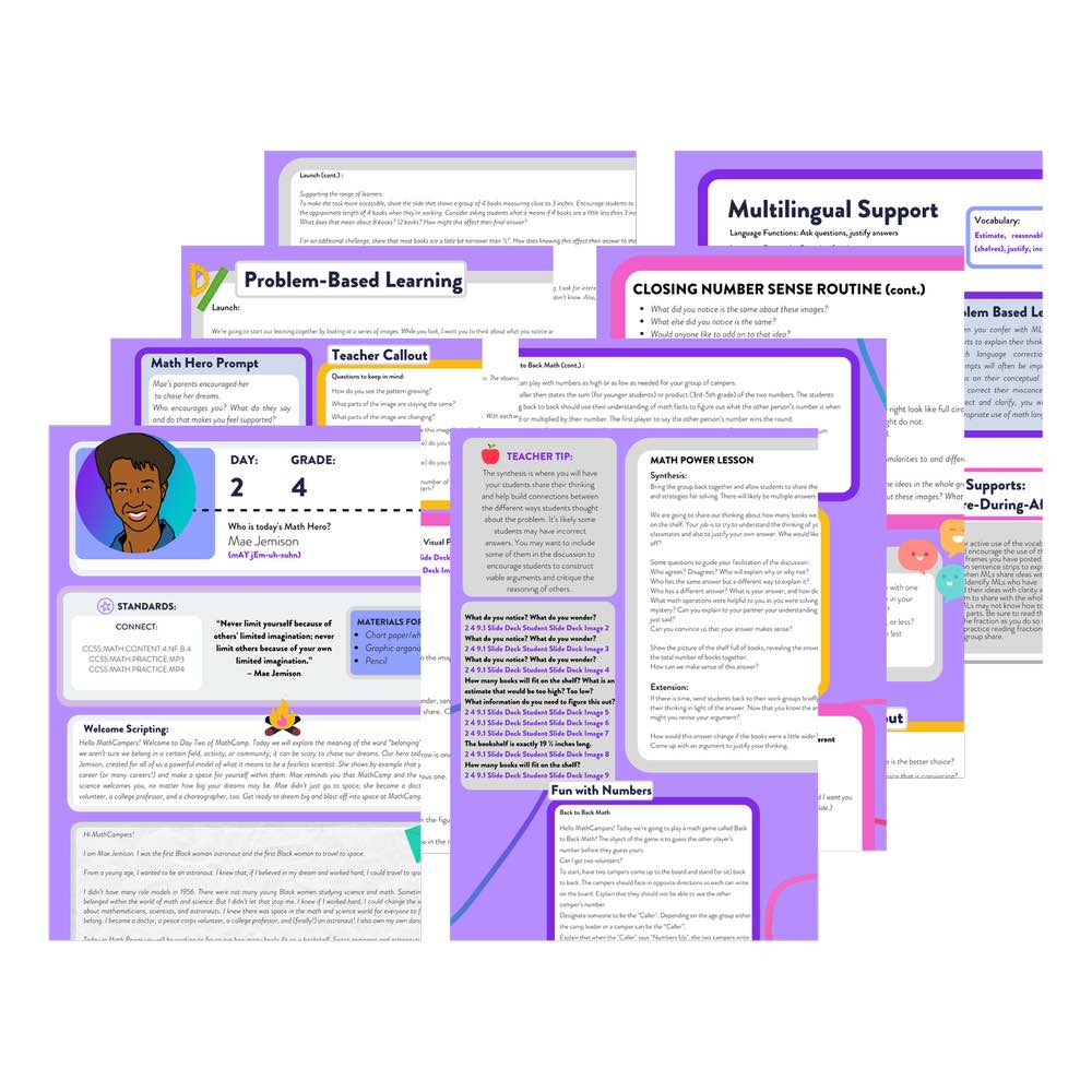 With MathCamp, all campers are empowered to think and reason mathematically. The lessons are crafted to allow various ways to tackle problem-solving, so students have different pathways to connect with the content. One of the aspects of MathCamp that I love is the Math Heroes highlighted throughout the curriculum. These include 18 extraordinary people who used math to change the world, from Mae Jemison to Albert Einstein.