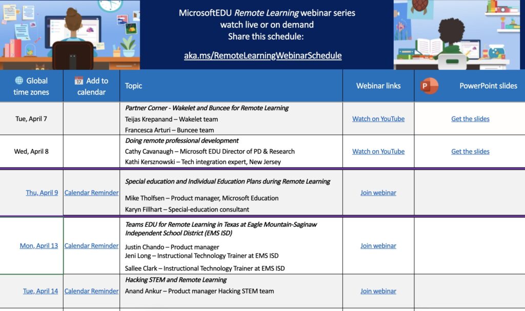 As you can see in the image above (or this live link), the remote learning webinars are led by a range of education professionals. The presenters of these professional development events include Microsoft Education team members as well as school-based educators and consultants.