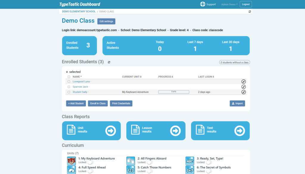 If you haven’t used TypeTastic School Edition before, it is a K-12 keyboarding curriculum along with a suite of teacher tools. Within the curriculum, students have access to more than 700 entertaining activities to support typing practice. From games to paragraph drills, there are various activities designed to support student learning as they make their way through the curriculum.