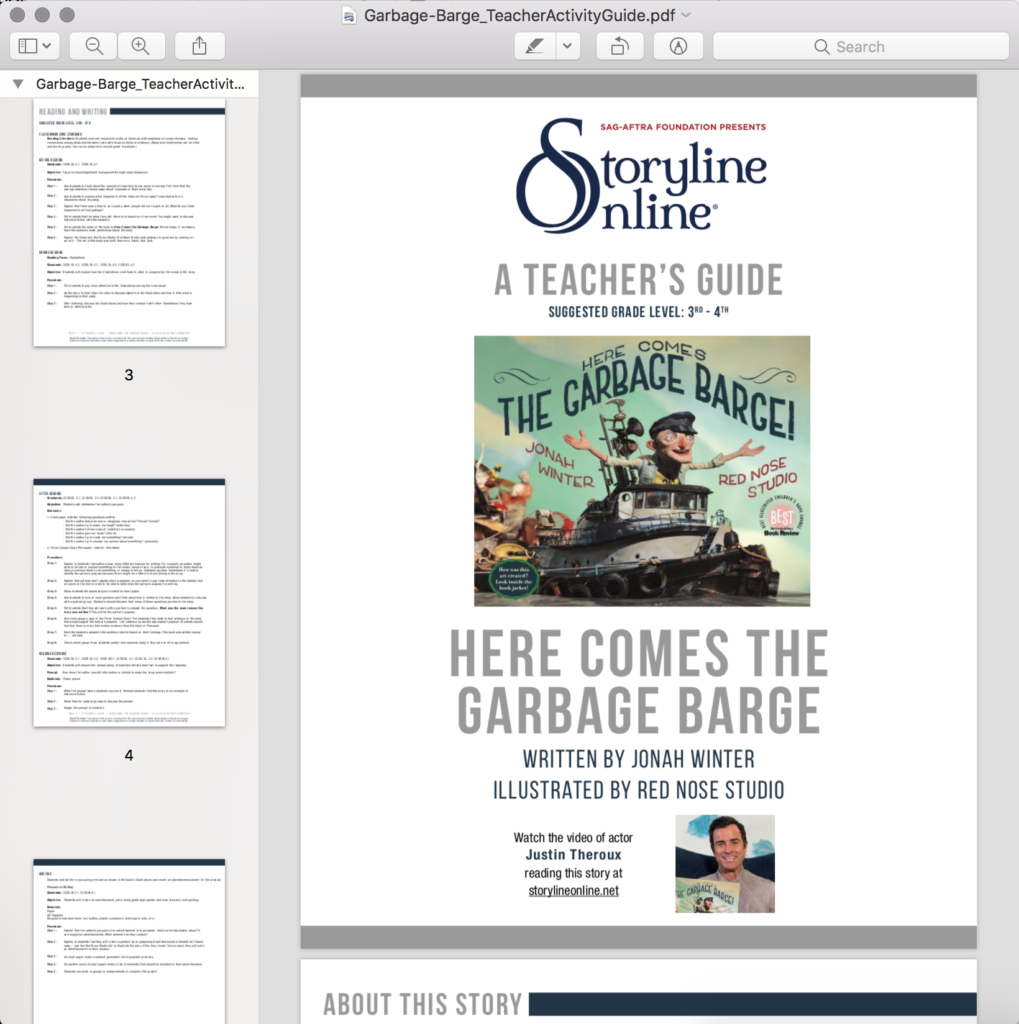 When you click on the activity guide button, you’ll see both a teacher and parent version. This spot is where you will find a PDF lesson guide full of information ready for your next English Language Arts lesson or cross-curricular connection. The image below provides a quick snapshot of the resource you’ll find when visiting the Here Comes the Garbage Barge landing page.